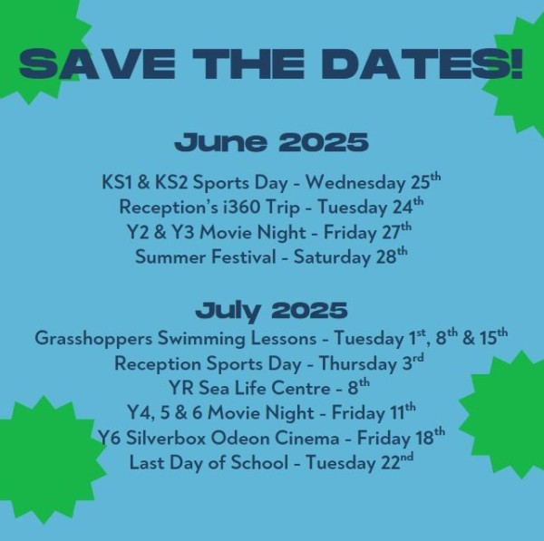 A quick reminder: Sports Day for Years 1 to 6 will take place on Wednesday 25th June, and Reception Sports Day will be held on Thursday 3rd July. We can’t wait to welcome you to cheer on the children!